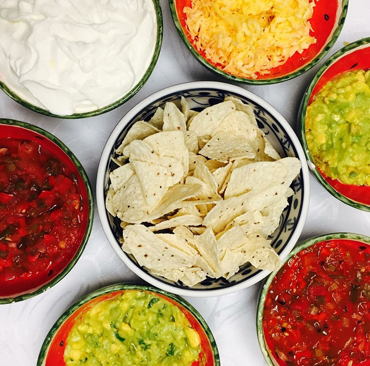 Mexicana: totopo com chilli, salsa, guacamole, sour cream, tortilla, tacos, churros;