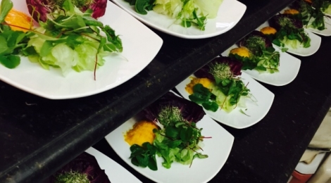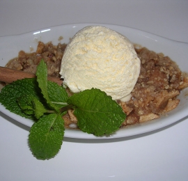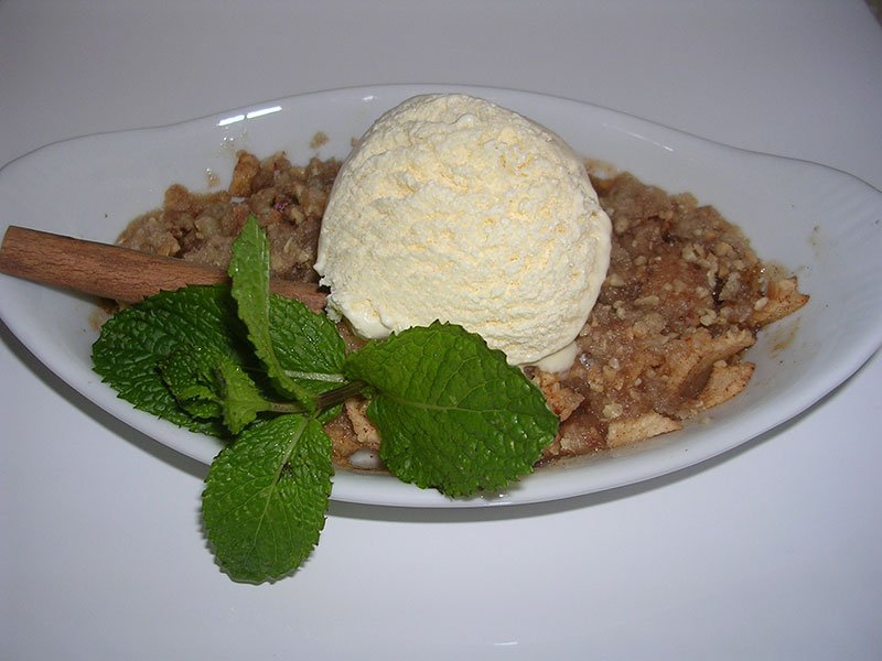 Contemporânea: barquinha de palmito e alho poro, salada de folhas, risoto de açafrão, filé mignon ao molho de cogumelos, crumble de maça com sorvete de creme;